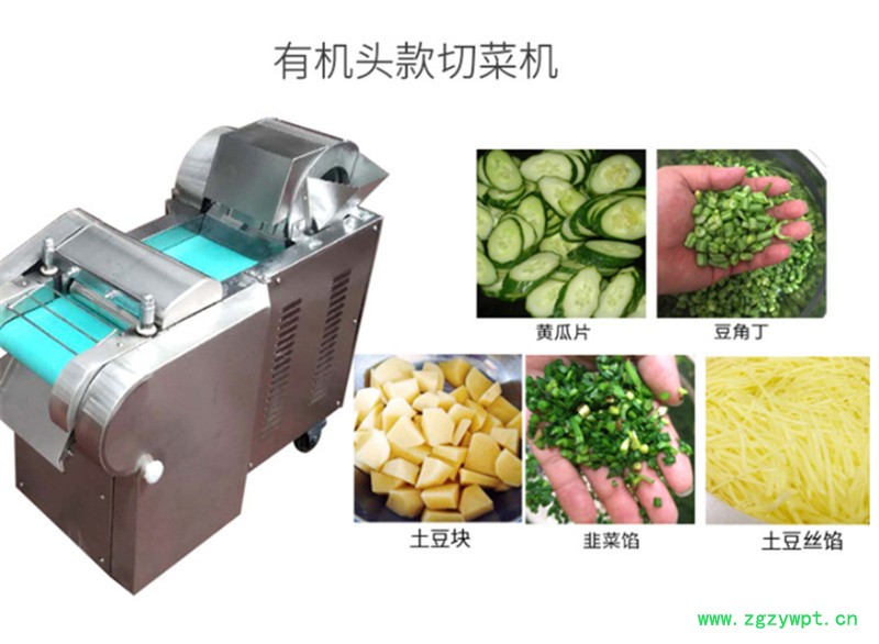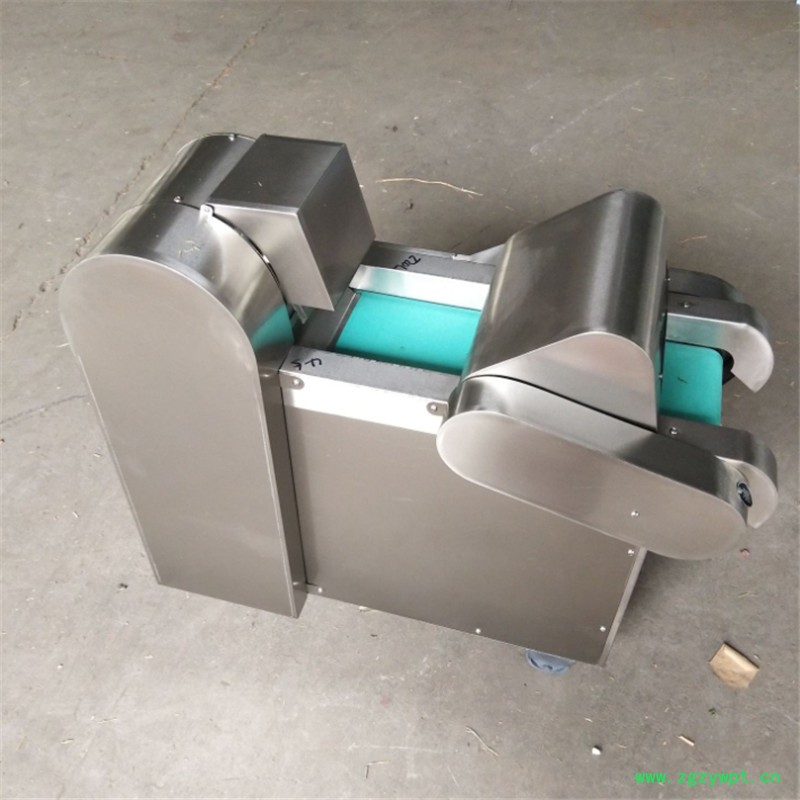 包含单切机的所以功能的同时,也可切圆形如土豆、萝卜等。可将根、茎、叶等蔬菜加工成片、丝、丁、菱、曲线、花丁、花片等。切片装置用于硬菜(萝卜、土豆、水果、薯类)的切片,厚度在1-10毫米内自由调整;往复竖刀将刀成的菜片或软菜(韭菜、芹菜)切成直丝或段、曲线丝、方丁(或形刀)输送带每次移动距离1-20毫米自由调整。所调整量即为丝段的宽度;应注意被切菜直径较粗时(大于30毫米)出片效果才好,便于切丁,直径小时制的片或丁将会杂乱。被切菜加工面平整光滑、规则,组织完好,保持手工切制的效果。
