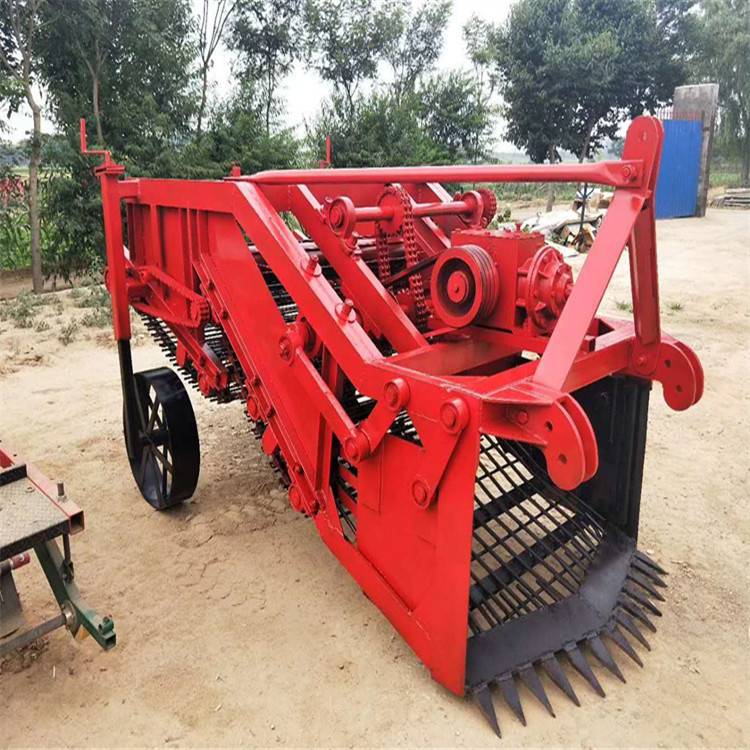 拖拉机后输出轴带动药材收获机。通过拖拉机后升降臂,中间拉杆连接固定收获机,调节好深度,然后开动机器,松土铲插土壤中,将药材的根茎从土壤中铲出,根茎连同土块进入振动筛上,对包裹药材根茎的土块进行振动操作,振动掉一部分土块。振动后的土块和药材根茎进入振动筛上,再漏掉一部分土块,压辊可以把大的土块碾压成小的土块,对小的土块进行进一步振动,经过碾压振动后的土块和药材根茎压碎的土块从筛子底部漏掉,药材和土大部分分离。节省人力物力,大大提高收获效率。
