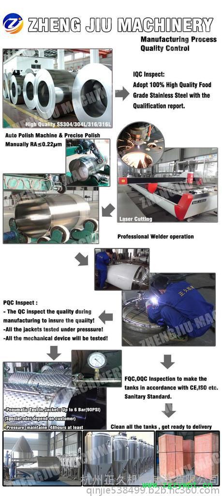 啤酒发酵成熟后,需要将发酵液中的酵母等混浊物过滤去除,使酒体清澈透亮,发酵液过滤好之后**叫“清酒”,供给包装部门灌瓶成为成品,清酒罐**是用来盛放清酒的。清酒罐分为单层清酒罐和三层清酒罐。我公司可生产清酒罐采用卫生级SS304不锈钢材质,自动氩弧焊,内表面全镜面抛光。所有罐采用卫生级卡箍连接,抗压高达14.5PSI,测试压力为30PSI。且我公司可以为啤酒厂量身打造所需产品。