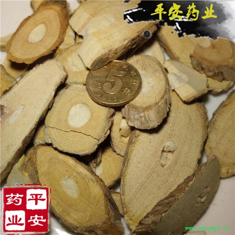 【性    状】不规则形的厚片,外表面灰褐色,周边棕褐色;木部约占1/3,黄白色,散布多数灰棕色小孔