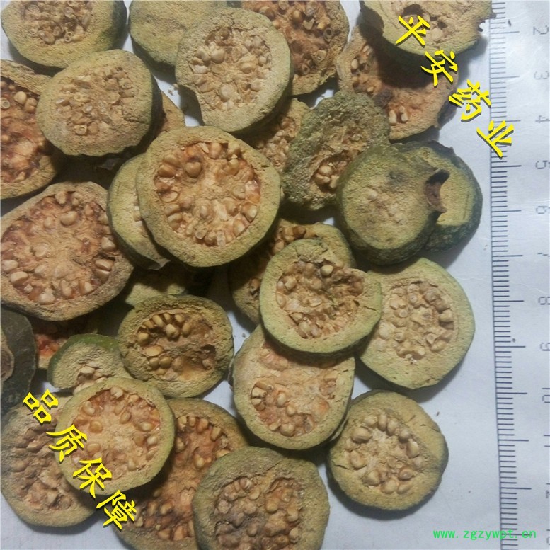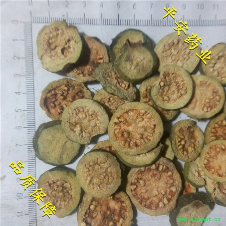 【性 状】不规则片圆状,表皮黄绿色,断面清晰可见密布种子