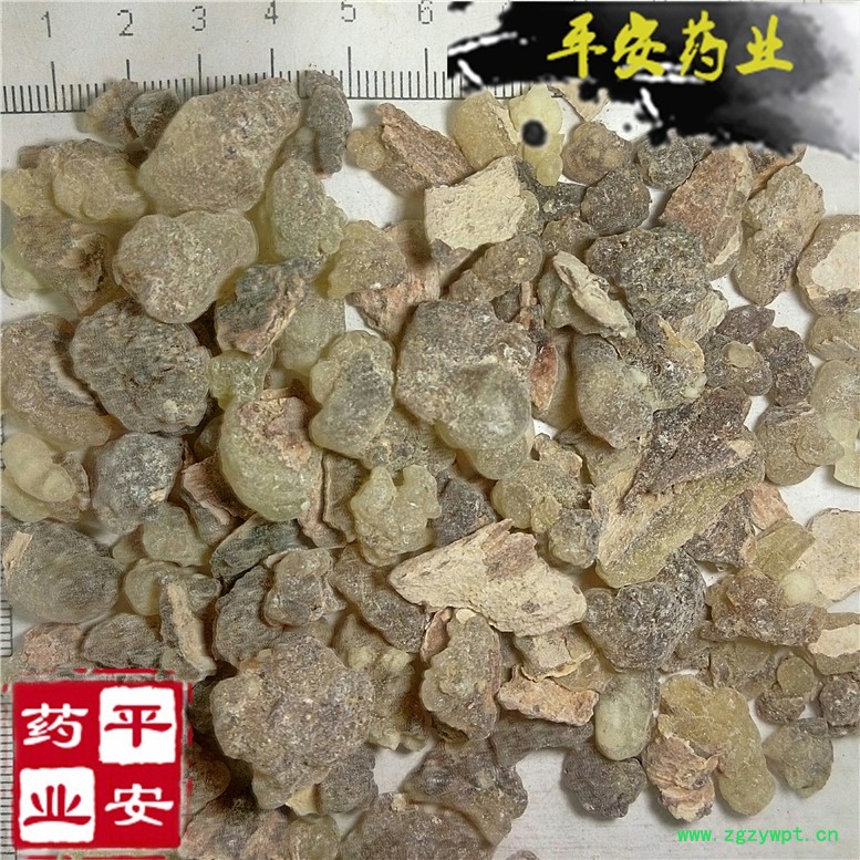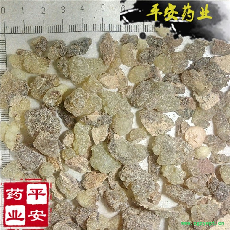 【性 状】本品呈长卵形滴乳状、类圆形颗粒或粘合成大小不等的不规则块状物。大者长达2cm(乳香珠)或5cm(原乳香)。表面黄白色,半透明,被有黄白色粉末,久存则颜色加深。质脆,遇热软化。破碎面有玻璃样或蜡样光泽。具特异香气,味微苦