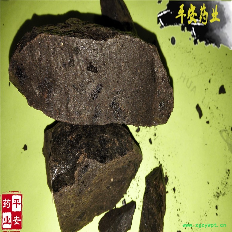 【性 状】呈方形或不规则块状,大小不一。表面棕褐色或黑褐色,光滑而稍有光泽。质硬,易碎,断面不整齐,具光泽,有细孔,遇潮有黏性