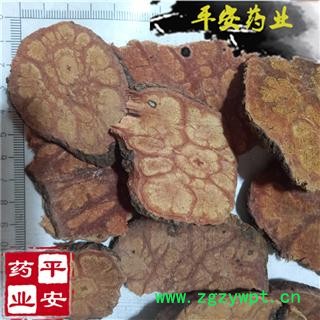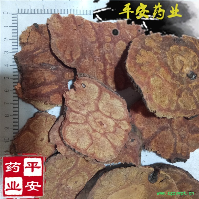 【性 状】呈圆形,稍扭曲。表面粗糙,灰棕色或灰褐色,具不规则皱沟纹。质坚实,难折断,切断面皮部棕红色,木部浅棕色,有2-4圈深棕红色环纹,习称“鸡眼圈纹”,针孔状导管细而密