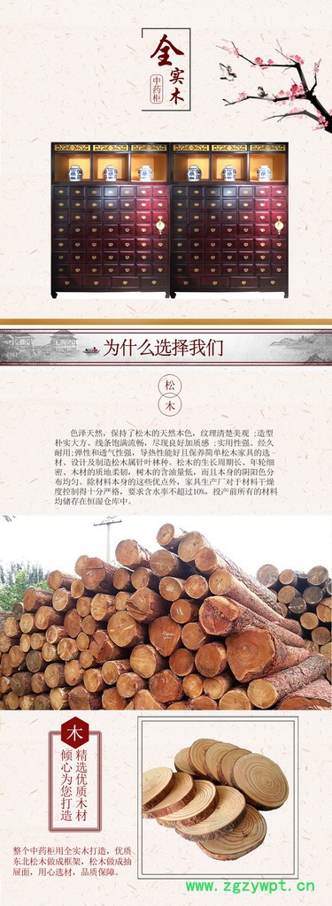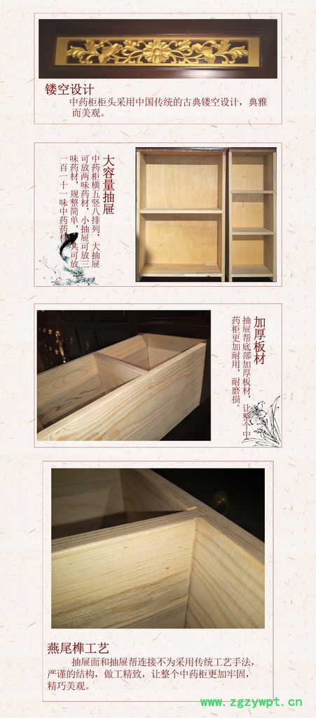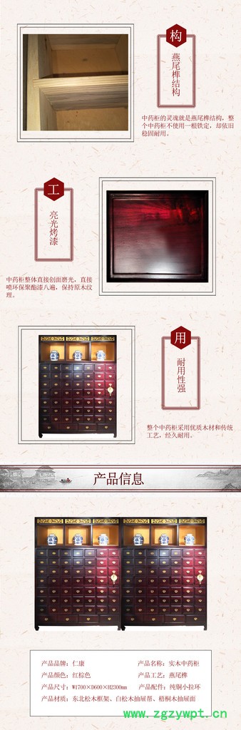 | 为什么选择我们: | 松木: 色泽天然,保持了松木的天然本色,纹理清楚美观 ;造型朴实大方、线条饱满流畅,尽现良好加质感 ;实用性强、经久耐用;弹性和透气性强导热性能好且保养简单松木家具的选材、设计及制造松木属针叶林种。松木的生长周期长、年轮细密、木材的质地柔韧,树木的含油量低,而且本身的阴阳色分布均匀。除材料本身的这些优外,家具生产厂对于材料干燥度控制得十分格,要求含水率不超过10%,投产前所有的材料均储存在恒湿仓库中。 | 木: 精选**木材 倾心为您打造 整个中药柜用全实木打造,** 东北松木做成框架,松木做成抽 屉面,用心选材,品质保障。 | 构: 燕尾榫结构 中药柜的灵魂**是燕尾榫结构,整 个中药柜不使用一根铁定,却依旧 稳固耐用。 | 工: 亮光烤漆 中药柜整体直接创面磨光直接 喷环保聚酯漆八遍,保持原木纹 理。 | 用: 耐用性强 整个中药柜采用**木材和传统 工艺,经久耐用。 |