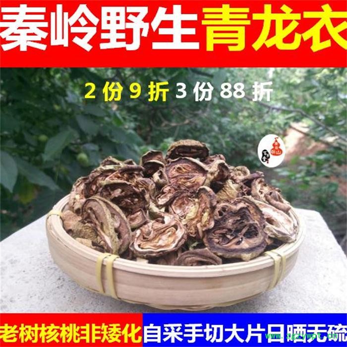 【药材优势】产自南水北调中线水源涵养地的秦岭山区,野生的百年老核桃树所结核桃。圆润、皮厚、味涩、味苦、水多、有效成分含量高,自采、日晒、手切无硫精选大片。可治皮肤病抗肿L等。500g一份。