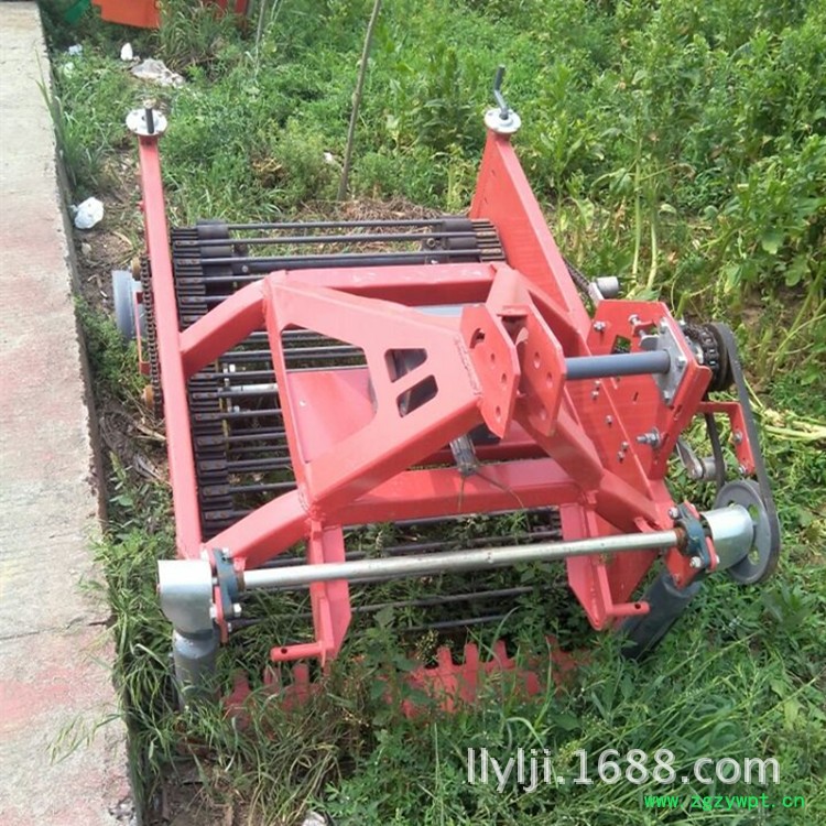 将传动轴安装在拖拉机的后输出轴上,并安装好拖拉机的牵引装置(拖拉机的随车配件)。调整拖拉机使其位于花生收获机正前方的适当位置,使拖拉机熄火,将传动轴的另一端安装在花生收获机变速箱的华健轴上,插上锁销并锁定。(2)、将拖拉机的牵引板和拉丝机分别安装在花生收获机对应的牵引及吊架上,锁定好各串销和牵引销。(3)、拖拉机的牵引板拉丝(拖拉机的随车配件)调整适当。