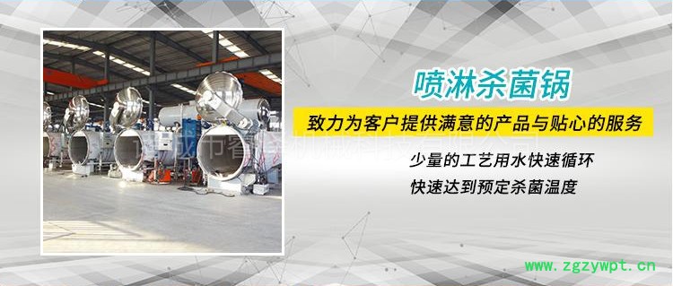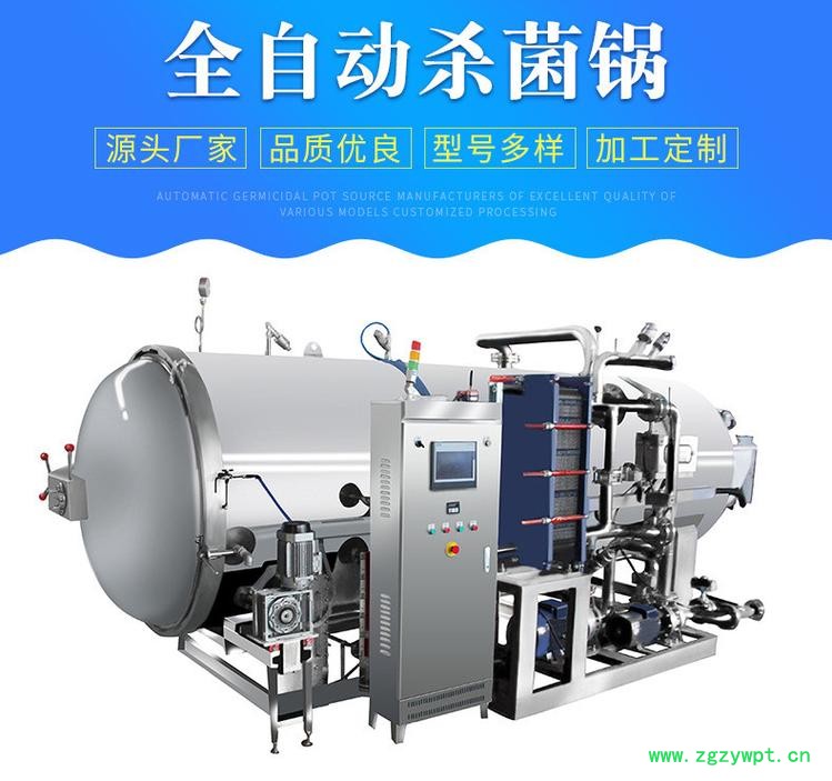 杀菌锅由锅体、锅盖、开启装置、锁紧楔块、安全联锁装置、轨道、灭菌筐、蒸汽喷管及若干管口等组成。锅盖密封采用充气式硅橡胶耐温密封圈,密封可靠,使用寿命长。具有受热面积大,热效率高、加热均匀、液料沸腾时间短、加热温度容易控制等特点。从控制方式上分有五种,分为手动控制型、电气自控型、电脑自控型、电脑半自动控制型、电脑全自动控制型(远程控制型)等五种。其设备应用广泛,主要应用于:肉制品加工厂、罐头加工厂、菌类加工厂、豆制品类加工厂等。