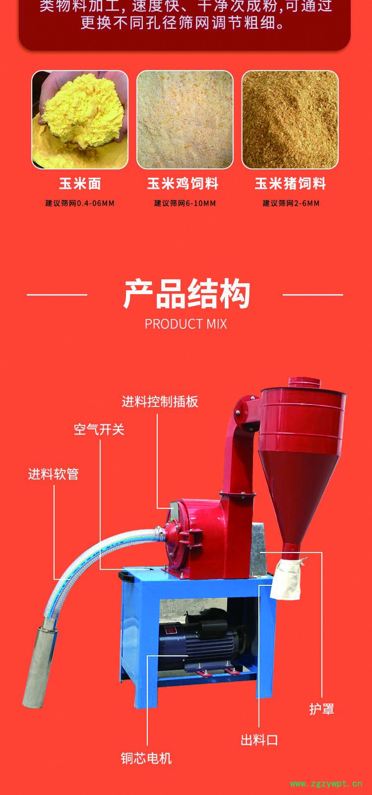 该机具有结构简单,安装使用维修方便,使用范围广等特点。适用于粮食粉碎,农作物粉碎,中草药材粉碎,薯类粉碎,调料粉碎,饲料粉碎。它是一种小型﹑多用﹑新式粉碎机,不但能粉碎玉米﹑高梁﹑大米﹑小麦﹑大豆等各种粮食,也能粉碎水渍大豆﹑干鲜薯类﹑花椒﹑中草药等;适合广大城乡单位和家庭粮食加工﹑饲料加工和其它专业加工使用。