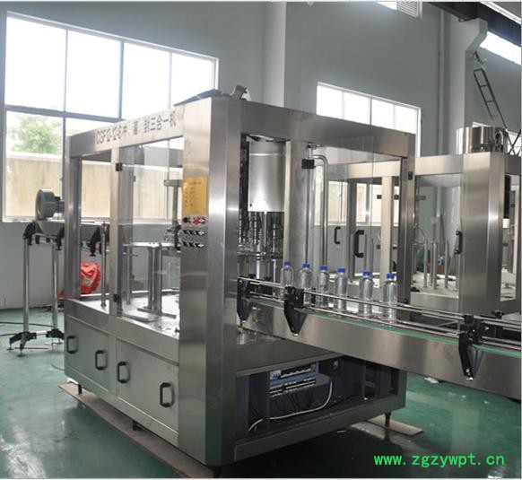 本系列设备用于聚脂瓶装各种纯净水、矿泉水的生产。在一机上实现冲瓶、灌装、封盖。整机设计科学合理,外形美观,功能齐全,操作维修方便,自动化程度高。综合采用意大利、德国先进技术。灌装速度快,液面控制稳。采用风送进瓶、夹瓶口、冲洗、卡瓶口灌装、封盖、不受瓶子高矮限制,只要瓶口、瓶盖相同随意更换瓶形,更换一下拔轮板即可。油尼龙齿轮传动,噪声小,整机运转平稳。采用磁力扭矩式拧盖头,实现抓盖、拧盖功能。拧盖力矩无级可调,具有恒力矩旋封塑盖功能,且不伤盖,封口严密可靠。水平回转式气力理盖器,具有不损坏瓶盖表面,料斗内缺盖发信号自动补充盖等功能。整机采用PLC电脑程序控制及人机界面触摸屏按钮,具有料缸内液面自动控制,无瓶不灌装,无瓶不加盖功能,并有拨瓶星轮卡瓶错位停机,盖滑槽内缺盖停机等功能。