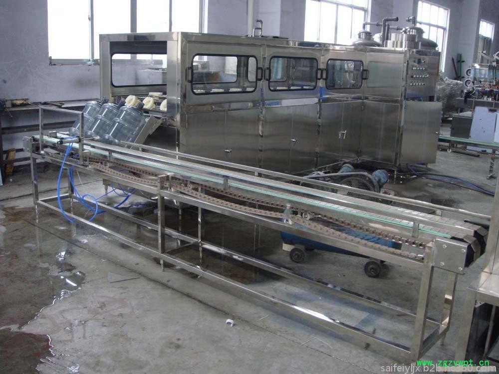 该生产线是3-5加仑桶装饮用水生产之用,型号有100型、150型、200型、300型、450型、600型、900型、1200型。该系列桶装生产线由洗瓶、灌装、封口三部分组成。洗瓶机采用多道洗涤液喷射和消毒液喷射,达到洗涤、消毒的目的,消毒液可以循环使用。封口机可以自动封口,输送瓶盖过程中配有卫淋装置,以确保瓶盖无菌清洁。该系列生产线均可自动洗涤、消毒、灌装、压盖、计数和输出。具有功能齐全、设计新颖、自动化程度高等特点,是集机、电、气于一体的新型饮用水桶装设备。