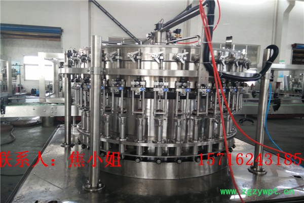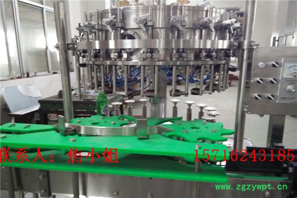 我厂生产的含气饮料三合一灌装线适合聚脂瓶装各种碳酸饮料的自动化生产。冲瓶、灌装、封盖自动完成。整机性能先进、实用美观,功能齐全,操作维修方便,自动化程度高,灌装速度快,液面控制稳定。如:无瓶时不灌装,冲气或灌装时爆瓶则灌装阀将自动关闭,并有自动冲洗等先进自控技术。采用托瓶提升气 缸,油尼龙齿轮传动,噪声小,整机运转平稳。采用磁力扭矩式拧盖头,实现抓盖、拧盖功能。拧盖力矩无级可调,具有恒力矩旋封塑盖功能,且不伤盖,封口严密可靠。水平回转式气力理盖器,具有不损坏瓶盖表面,料斗内缺盖发信号自动补充盖等功能。整机采用PLC电脑程序控制及人机界面触摸屏按钮,具有料缸内液面自动控制,无瓶不灌装,无瓶不加盖功能,并有拨瓶星轮卡瓶错位停机,盖滑槽内缺盖停机等功能。可根据用户的不同要求定做各类生产线。