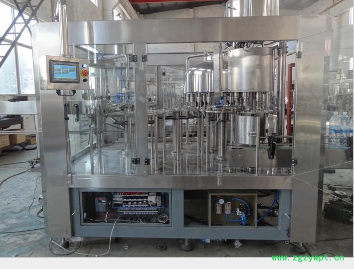 瓶装苏打水灌装生产线本机主要用于灌装作业,将冲洗、灌装、封口三合一体,触摸屏操作全过程,实现自动化,使用于聚酯瓶,塑料瓶。主要灌装矿泉水、纯净术等不含气液体,各部位可以根据瓶形自如调整,简单快捷,稳定可靠。本机采用先进的PLC控制系统,控制机器的自动运行。进瓶使用风送装置,输出瓶链道采用可调速方式,与主机相互配合运行更稳定,操作简单。自动化程度高,是矿泉水、纯净水等生产厂商的理想设备。
