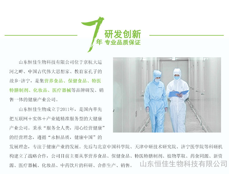 山东恒佳生物科技有限公司目前主要从事营养食品、保健食品、特医特膳制剂、植物萃取、药食同源、新资源、化妆品、中药饮片的科研、合作生产、销售。