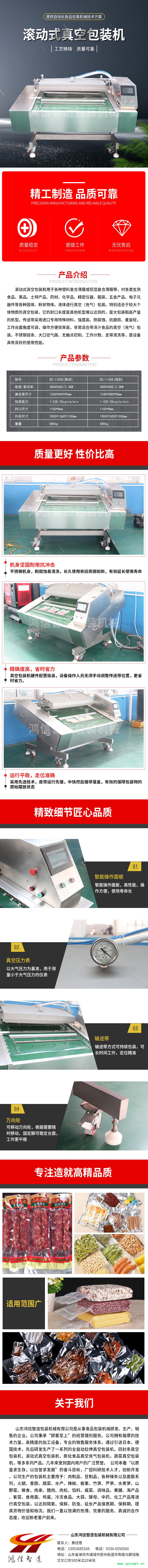 滚动式真空包装机用于各种塑料复合薄膜或铝箔复合薄膜带,对各类生熟食品、果品。土特产品、药材、化学品、精密仪器、服装、五金产品、电子元器件等各种固体、粉状物体。液体进行真空(充气)包装。特别适合于较大个体物质的真空包装,它的封口长度是其他机型难以达到的,是大包装和高产量的机型。传送带采用进口专用特殊材料,强度高、耐腐蚀、抗磨损、重量轻,工作台面角度可调,操作方便效率高,非常适合带汤汁食品的真空(充气)包装。不锈钢链条、大口径气路、无触点控制、工作计数、走带清洗等,是设备具有良好的使用性能。
