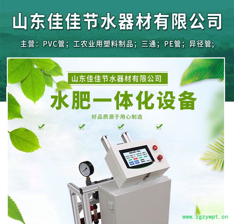 | 公司介绍 山东佳佳节水器材有限公司主要产品有: PE/PVC管材管件;滴灌管、滴灌带、旋转(折射)雾化微喷头,迷宫式滴灌带;压力补偿式滴头、稳流器、四出口稳流滴箭、地插微喷、微喷带、过滤器、施肥器、出水口、全自动水肥一体机、射频卡灌溉控制器、变频器、水泵、阀门、水表等喷灌、滴灌、微喷节水灌溉设备的销售及安装。 售前和售后 一、售前服务 公司为客户提供喷灌,滴灌,微喷等节水灌溉工程设计方案。 二、售后服务 公司为客户提供优良的安装指导服务。客户一旦采用我公司产品,本公司将提供优良的指导服务,大客户可以派专人到工地进行指导安装 并负责调试,解决您的安装烦恼。 山东佳佳节水器材有限公司的以诚信为本、以质量说话、以服务为导向俘获一大批新老客户的支持,获得业界的赞誉。 山东佳佳节水欢迎各界朋友莅临参观、指导和业务洽谈! |