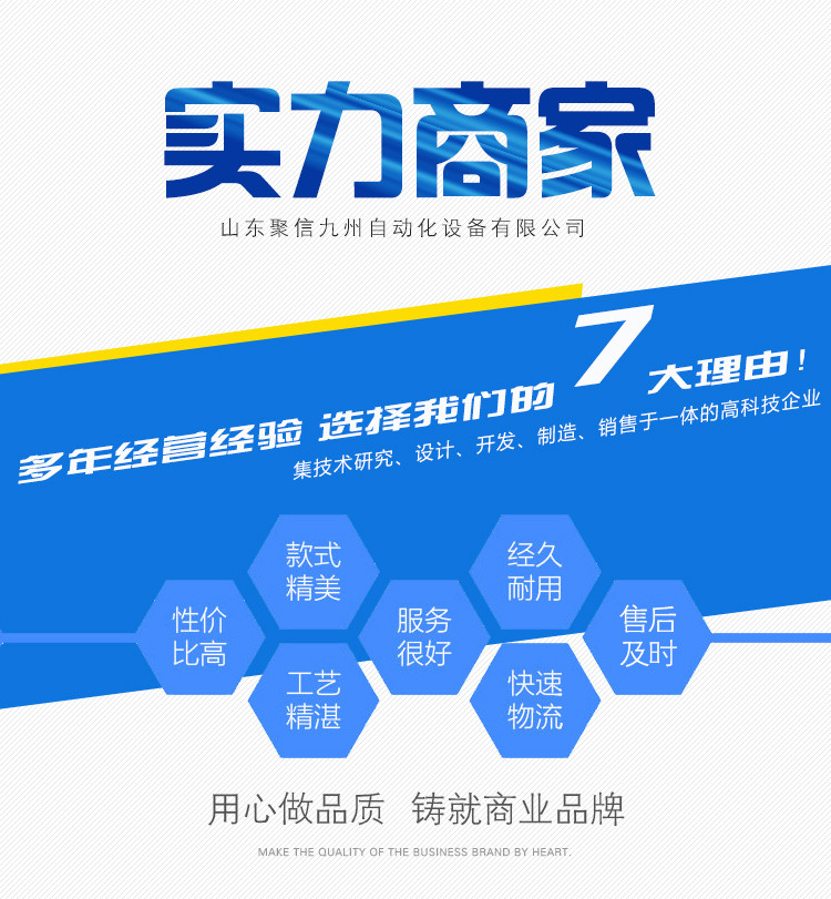 山东聚信九州自动化设备有限公司在坚持企业经营宗旨的前提下,不断改良创新,产品已在食品、水产、日化、电子产品、化工、农药等行业广泛使用,产品畅销全国各地。进一步满足了广大顾客的需求,成为消费者心中信赖的品牌。