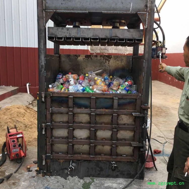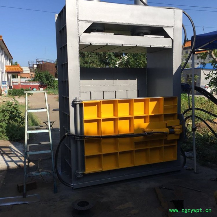 立式液压打包机主要由液压缸、电机与油箱、压盘、箱体及底座、上门、下门、门闩、打包带支架、铁支等构成。