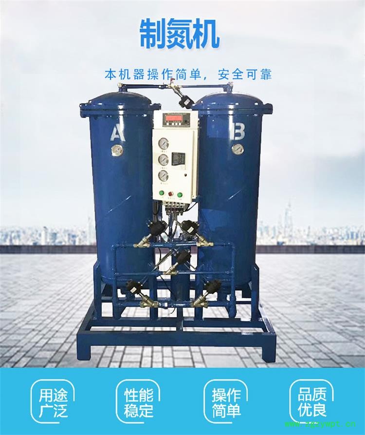 制氮机是根据变压吸附原理 ,S先由空压机将空气经压缩机压缩至所需压力进入空气储罐,使空气压力变化比较平稳缓解成静压力,经空气储罐除去压缩空气中的大量液态水和油,再经由空气处理系统冷干机, 四 过滤除去压缩空气中的水、油、粉尘,将原料空气变成为洁净而稳定的压缩空气,再经过PSA变压吸附制氮装置,生产出氮气。