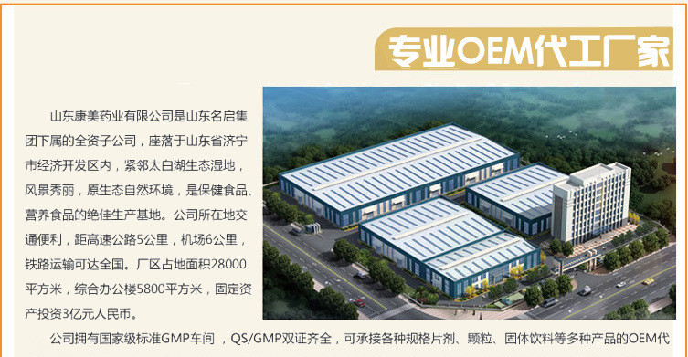 山东康美药业有限公司是一家集研发生产为一体的生产加工企业,拥有十几年的oem贴牌代加工经验,本公司能做剂型有:片剂、粉剂、颗粒剂、口服液、易拉罐饮料、消杀、袋泡茶、贴剂、膏剂等剂型,另有上百种自主**产品可供选择代理,详情请咨询客服或者电话联系