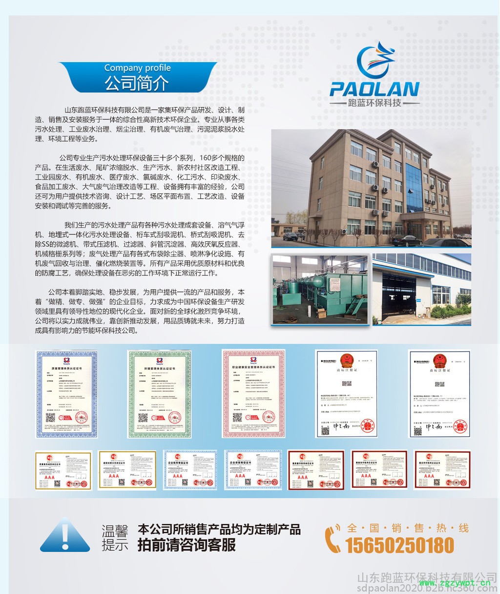 采用新型高效的溶气设备——微气泡发生器,代替传统的引气设备向水中溶气,并在气浮区域内安装若干斜管组,包括箱体、刮渣机、螺旋出料机共同组成一个完整气浮净水装置。理论上讲,气浮的处理效果与停留时间是没有直接联系的,而只与气浮面积有关,如果将水深H的气浮区减少为水深H/10,那么气浮距离和停留时间都将缩小10倍,这**是“浅池理论”。气浮区加入斜管的目的是增大气浮面积,大大降低了雷诺系数,使气浮避免在紊流状态下进行,制造良好的层流状态,达到浅层气浮的效果。