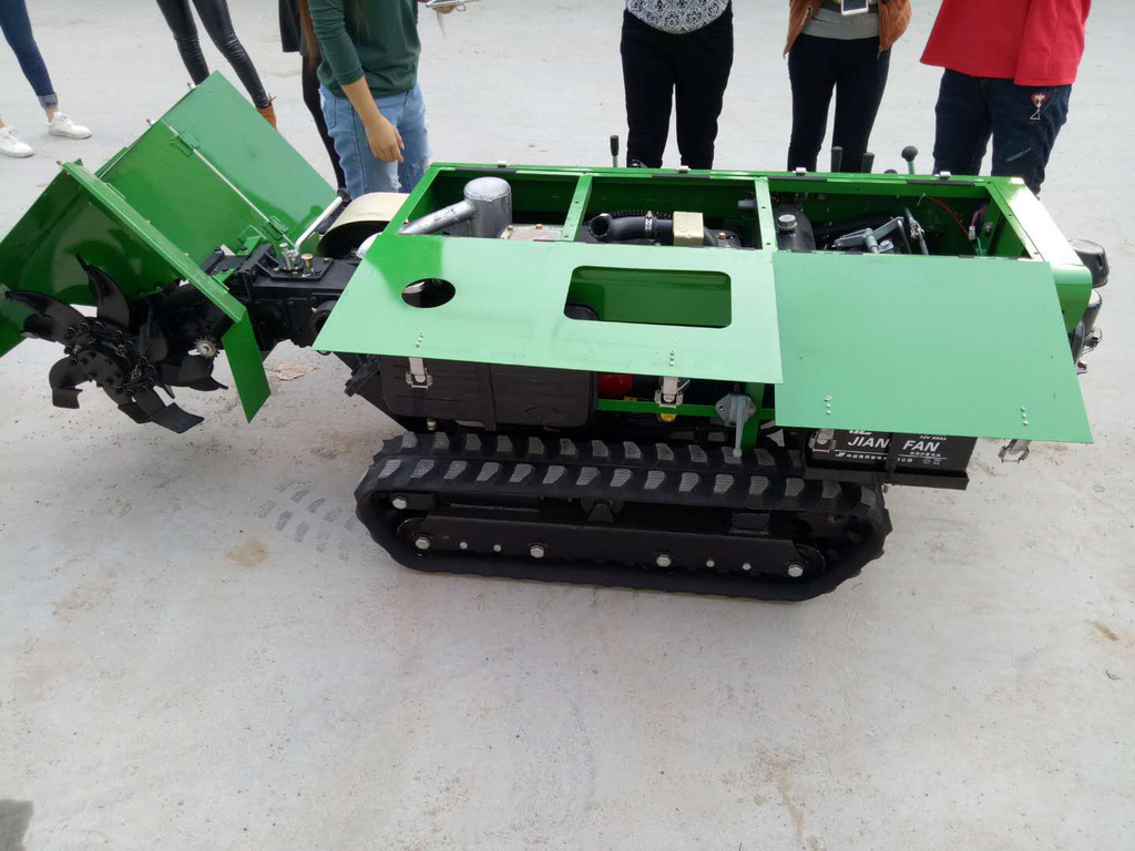 2F-30型自走式多功能开沟施肥机 ,该产品应有各种 ,主要用于果园开沟施化肥和有机肥料、旋耕、喷药、除草、园区开沟排水作业。该机体积小(外形尺寸为:总长249厘米、宽100厘米、高75厘米),操作灵便,可原地转向。有六大功能:1、开沟施肥自动回填;2、单独开沟;3、单独回填;4、旋耕;5、除草6、风送喷药。开沟宽度为30厘米,开沟深度为0~40厘米可调,作业速度为每小时450米~1200米;施肥深度为0~35厘米可调,旋耕装置宽为105厘米可定制120厘米,除草90厘米;回填装置宽为155厘米;喷药装置总高度为130厘米可加高50厘米自由拆装,全套总重1.1吨。车辆行走速度约为每小时0.5~5公里,分高低6个前进档位和2个到退档位,在机器左侧手动操作。该机动力采用28马力单缸柴油机,发动机为中置,行走变速箱和传动变速箱分开在丘陵地区开沟施肥作业时不用外加配重,箱内全部为齿轮传动,结实耐用。行走采用橡胶履带,行走直线性和通过性好,与地面接触面积大,不易打滑。开沟刀采用65锰钢自制,刀刃全部用耐磨焊条加强焊制,比普通开沟刀结实耐用至少10倍;采用蛟龙式强制排肥,下肥量可调,每米0.5~15斤,并且干的小块牛羊粪可通过施肥自动回填装置直接施肥,大块农家肥可通过单独开沟进行施肥;喷药采用风送式进口防滴漏陶瓷喷嘴和高效药泵,陶瓷片可更换,喷药幅宽5-10米,喷药高度5-8米,并且每个喷头可单独开关,大小可调方向可调,药箱为304不锈钢容积300升即600斤水。目前该机被广泛应用于各种果树、葡萄、核桃等经济作物的田间管理作用,堪称果园全能王,可节省大量人工!由于是**没有标准和鉴定大纲,只有企业标准山东不给做鉴定,目前尚无补贴,只有省级检验报告。此款不带遥控,由于电子产品易坏不易维修,农忙季节耽误事,公司也正在跟大学合作解决当前国产遥控质量不稳定现象,预计年底上市的5代机
