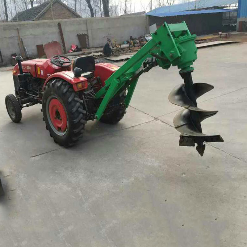 挖坑机由传动轴、减速器、钻头、拉杆和机架等组成。通过液压悬挂装置挂在拖拉机后面,由拖拉机动力输出轴经传动系统驱动钻头进行挖坑作业,钻头一般采用双螺旋型,有的挖坑机装有两个或两个以上的钻头,称多钻头挖坑机,能充分利用拖拉机功率和提高生产率。为使钻头在工作时不因遇到石块、树根等障碍物超负荷时受损,在传动轴上装有牙嵌式离合器,在超负荷状态下,离合器自动打滑,从而切断动力的传递。
