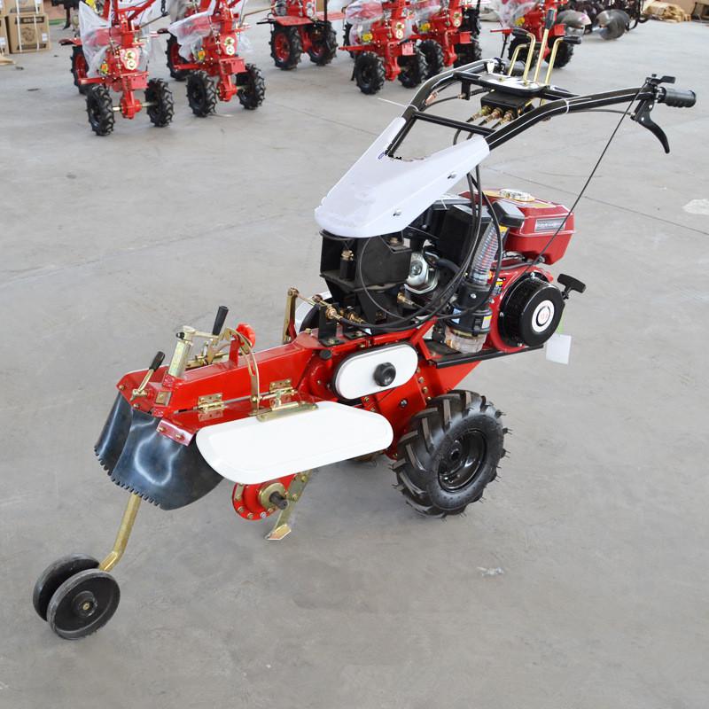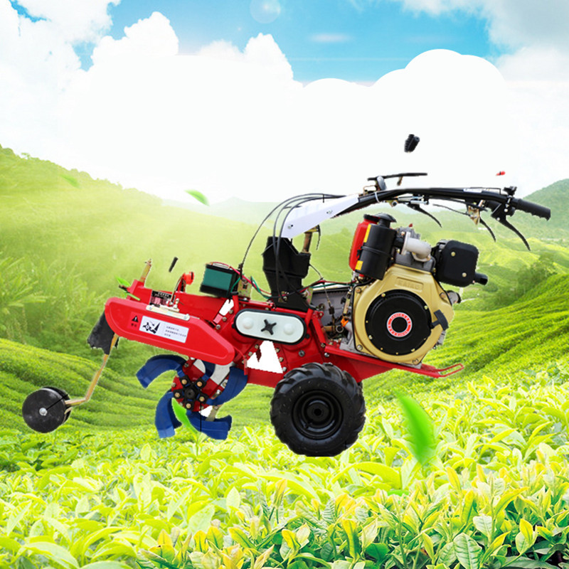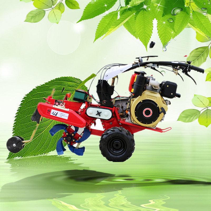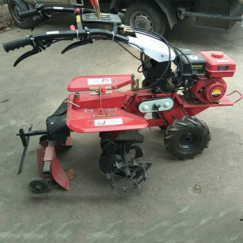 本机器包括机架、可调高低扶手,机架上设有(风冷或水冷)柴油机或汽油机、机架和扶手上设置有变速箱,变速箱的输出轴上设置有能够沿轴移动的驱动轮或链轨.传动方式主要有:全齿轮传动、皮带传动、链条传动三种传动方式.该机具有重量轻,油耗低、相对功率大,结构紧凑、机动性强、操纵轻便灵活的特点。可爬坡、越埂、阶梯性强。广泛适用于平原、山区、丘陵的旱地、水田、果园、菜地、烟地的深旋耕、浅旋耕、犁耕。配上相应机具可进行旱地旋耕、水田旋耕、抽水、开沟、喷淋、喷药除草碎土等作业,还可牵引拖车进行短途运输,是大中型农机无法**的多功能田园管理机,工作稳定可靠、使用寿命长、维修方便等特点。是进入农民家庭理想的田园管理机。