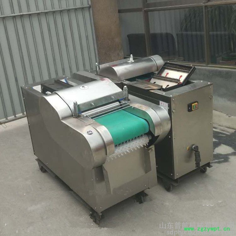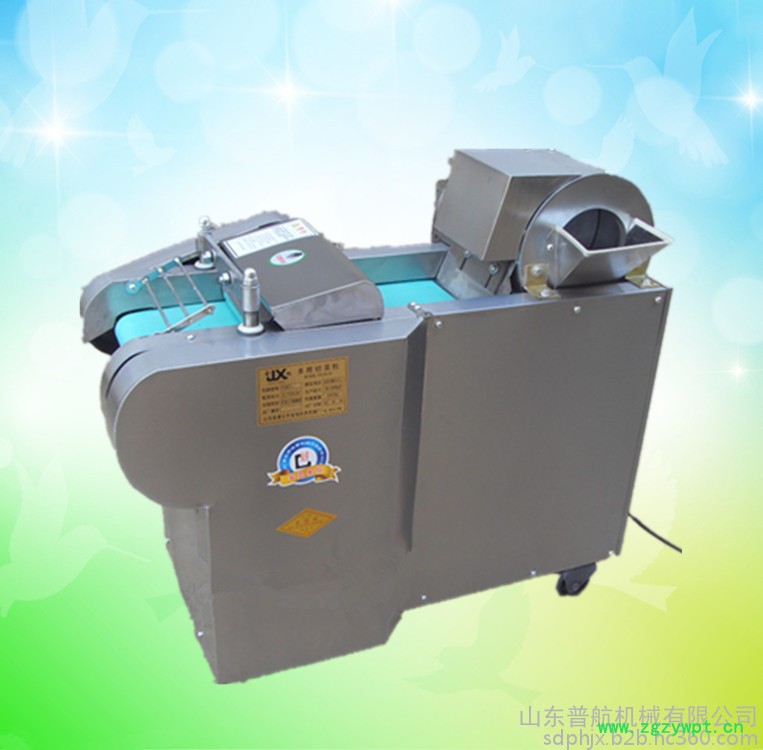 多功能型切菜机包含单切机的所有功能的同时,也可切圆形如土豆、萝卜等。 可将根、茎、叶等蔬菜加工成片、丝、丁、菱、曲线、花丁、花片等。切片装置用于硬菜(萝卜、土豆、水果、薯类)的切片,厚度在1-10毫米内自由调整;往复竖刀将刀成的菜片或软菜(韭菜、芹菜)切成直丝或段、曲线丝、方丁(或形刀)输送带每次移动距离1-20毫米自由调整。所调整量即为丝段的宽度;应注意被切菜直径较粗时(大于30毫米)出片效果才好,便于切丁,直径小时制的片或丁将会杂乱。被切菜加工面平整光滑、规则,组织完好,保持手工切制的效果。