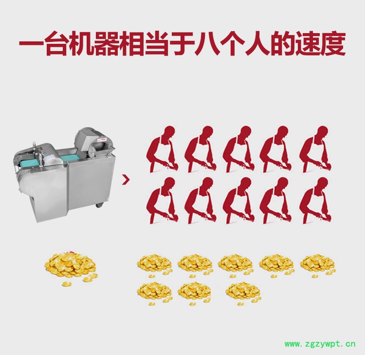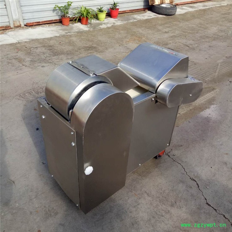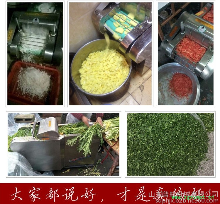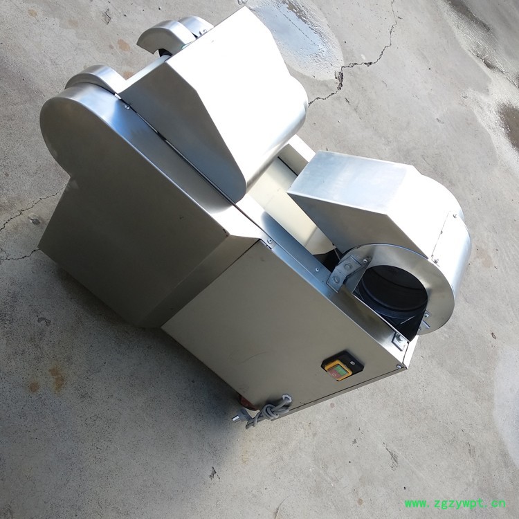 多功能型切菜机包含单切机的所有功能的同时,也可切圆形如土豆、萝卜等。 可将根、茎、叶等蔬菜加工成片、丝、丁、菱、曲线、花丁、花片等。切片装置用于硬菜(萝卜、土豆、水果、薯类)的切片,厚度在1-10毫米内自由调整;往复竖刀将刀成的菜片或软菜(韭菜、芹菜)切成直丝或段、曲线丝、方丁(或形刀)输送带每次移动距离1-20毫米自由调整。所调整量即为丝段的宽度;应注意被切菜直径较粗时(大于30毫米)出片效果才好,便于切丁,直径小时制的片或丁将会杂乱。被切菜加工面平整光滑、规则,组织完好,保持手工切制的效果。