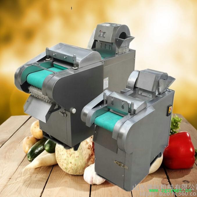 多功能型切菜机包含单切机的所有功能的同时,也可切圆形如土豆、萝卜等。 可将根、茎、叶等蔬菜加工成片、丝、丁、菱、曲线、花丁、花片等。切片装置用于硬菜(萝卜、土豆、水果、薯类)的切片,厚度在1-10毫米内自由调整;往复竖刀将刀成的菜片或软菜(韭菜、芹菜)切成直丝或段、曲线丝、方丁(或形刀)输送带每次移动距离1-20毫米自由调整。所调整量即为丝段的宽度;应注意被切菜直径较粗时(大于30毫米)出片效果才好,便于切丁,直径小时制的片或丁将会杂乱。被切菜加工面平整光滑、规则,组织完好,保持手工切制的效果。