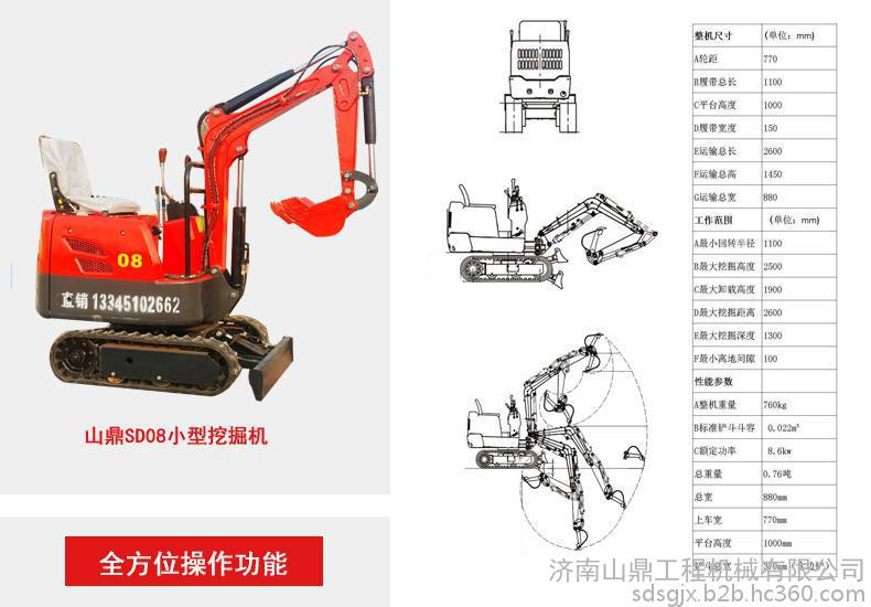 山鼎SD08小型挖掘机,是山鼎厂家2016**款小型挖掘机,是一款超级实惠型车型,同样,也是根据新老客户回馈所生产的一款车型,不仅挑战了业界**小车型,也是挖掘机界**便宜的一款超小型挖掘机。具备挖掘、破碎、清沟、钻孔以及配有推土铲,可以快速的更换的附件,机器利用率大大提高,能适用于各种土质,使用效率高,操作简单,能在相对狭小的空间施工作业。据调查了解,用山鼎小型挖掘机和大型挖掘机相对比,施工不仅比大型挖掘机节省成本,在狭小的场地作业更是增强了施工效率,比大型挖掘机施工作业省工、省时、更省力,还能降低成本,提高效率,简直是各种施工场地的“一把手”。