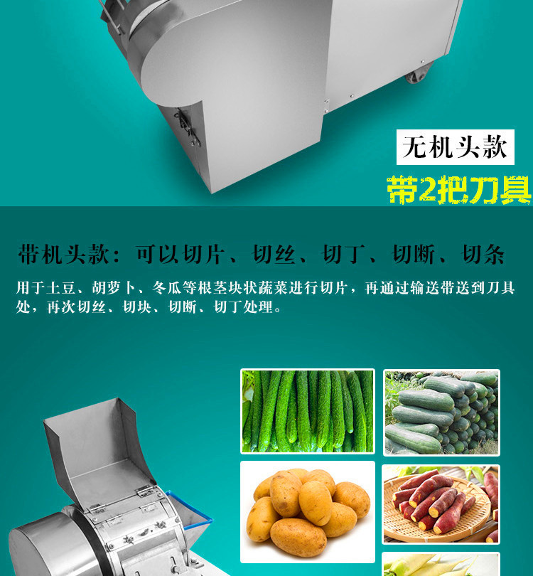 本机是模拟手工切菜原理,采用三级变速适应1--25mm切丝需要。离心式切片机构完成各种硬菜切片,自动输送到竖刀下切丝或切块。适用于硬、软根、茎、叶类蔬菜和海带的加工,可切制片、块、丝、丁、菱形、曲线形多种花样。是蔬菜脱水、速冻、保鲜、腌渍等食品行业及厂矿、企业、学校、部队等单位的食堂及宾馆、饭店蔬菜加工的设备。切片切丝机采用不锈钢,具有外形美观,操作简单,调整轻松,维护方便, ,噪音小,多产量等特点,工作效率高,物料控制,切片厚度在1-3mm,切丝切段宽度在1-25mm,能不同程度的替代人工切片切丝切段,切出的产品整齐,厚薄均匀,质量远远过手工