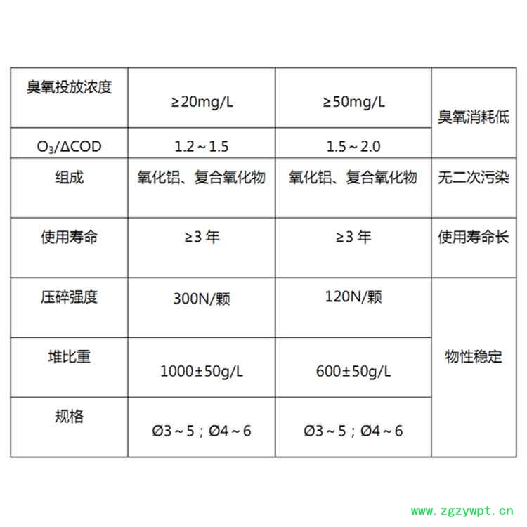 臭氧氧化催化剂是以稀土改性活性氧化铝为载体,以过渡金属复合氧化物为活性组分的高效有机废水净化用臭氧氧化催化剂;具有降解能力强、臭氧消耗低、无二次污染、使用寿命长等技术特点。低浓度COD降解用臭氧氧化催化剂适用于废水COD低于120mg/L的臭氧氧化系统,高浓度COD降解用臭氧氧化催化剂适用于废水COD高于120mg/L的臭氧氧化系统。