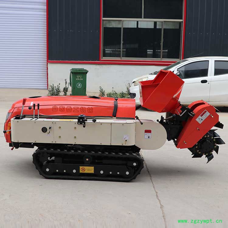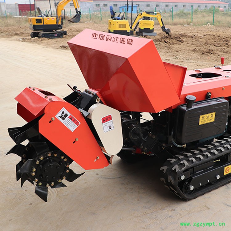 多功能履带式开沟施肥机安装上不同的配件可以进行单独旋耕、回填、单独开沟、施肥、也可混合搭配使用。产品结实耐用,性能优越,操作方便.耐用:机身加厚,密,履带式行走,可进行原地转向。都是加厚75号猛钢锻造,非常耐磨耐用,工作效率高.