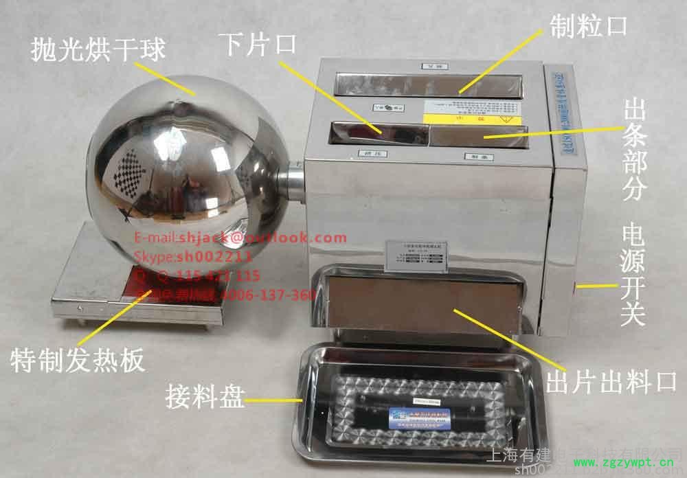 组成:由挤压出条离合滚轴、制丸滚轴、水丸包衣器、全齿轮变速、电机、电加热等部件组成。