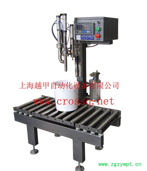 由称重传感器、电脑控制系统、灌装系统、封口机构、机架、滚道等组成。操作简介:人工移上桶;手动启动;自动开启输料泵及大小给料阀门;到设定工作点1自动关快给料阀门;到设定工作点2自动停输料泵并关慢给料阀门;人工加盖移桶至压盖位置;脚踏开关控制压盖,压盖结束人工移桶;入库。
