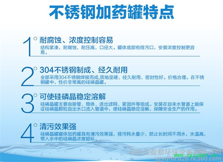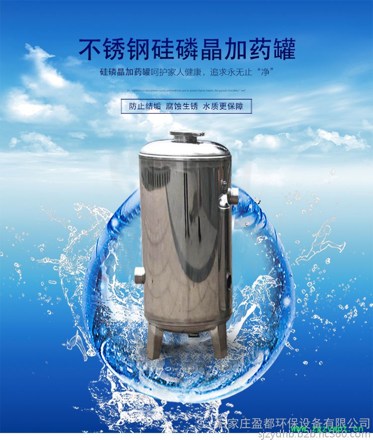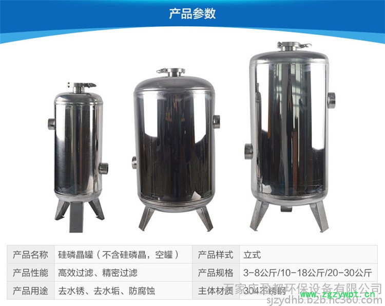 4、硅磷晶罐材质:对于不同的服役条件可考虑选择塑料,玻璃钢,碳钢、或不锈钢材质的硅磷晶罐。