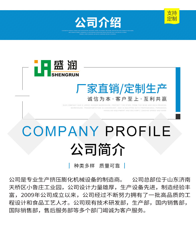 5、生产流程:原料混合→挤压膨化造粒→干燥→粉碎→包装