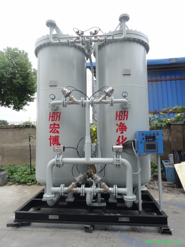 碳分子筛变压吸附制氮装置,是一种新型的空气分离设备,以压缩空气为原料,碳分子筛为吸附剂,采用变压吸附流程(简称P.S.A)。在常温低压下,利用空气中的氧和氮在碳分子筛中的扩散速率不同,把氧和氮加以分离,氮气的纯度和产气量可按客户需要调节。本公司生产的HBFD系列普氮型制氮装置,氮气纯度为98-**,产氮量为5NM3/H/FONT>1000 NM3/H,HBFD系列制氮装置与本公司生产的HBDC系列氮气纯化装置配套即成为高纯氮型制氮系统,氮气纯度为99.9995%,产氮量为5NM3/H?/FONT>1000 NM3/H,氮气中含氧量小于等于5ppm,露点小于等于-60℃.产品遍布石油化工,化工机械,化纤,医药,食品,饮料,钢带,电炉,工业炉等行业