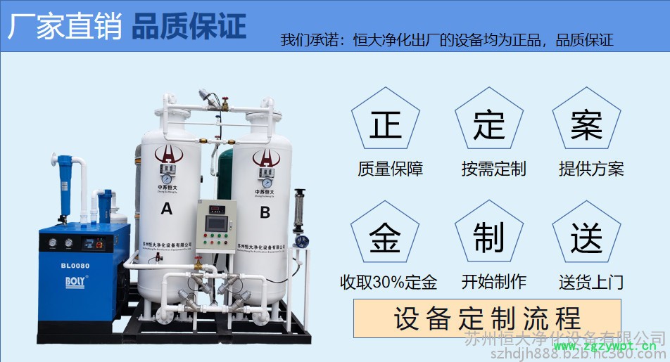 制氮机,是指以空气为原料,利用物理方法将其中的氧和氮分离而获得氮气的设备。根据分类方法的不同,即深冷空分法、分子筛空分法(PSA)和膜空分法,工业上应用的制氮机,可以分为三种。 恒大制氮机是按变压吸附技术设计、制造的氮气制取设备。制氮机以碳分子筛(CMS)为吸附剂,采用常温下变压吸附原理(PSA)分离空气制取高纯度的氮气。通常使用两吸附塔并联,由进口PLC控制进口气动阀自动运行,交替进行加压吸附和解压再生,完成氮氧分离,获得所需高纯度的氮气。