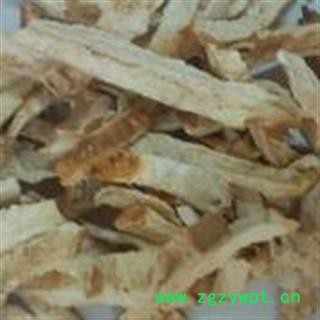 药材性状:机器切丝,厚约2~3毫米。外皮灰黄色较厚,周边多卷曲。切片表面浅白色,粗糙有筋脉。质柔软,易折断。无臭,味微苦。身干、色白、丝厚薄均匀