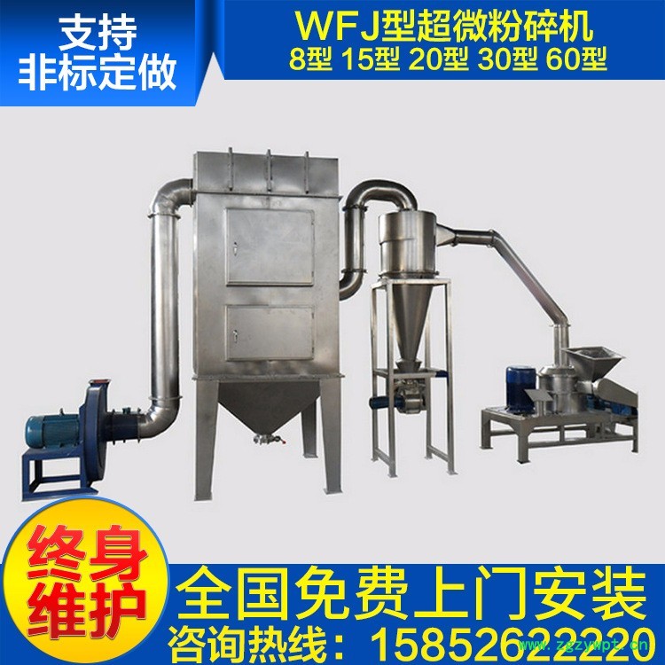 该机由加料斗、分级轮、粉碎刀片、齿圈、粉碎电机、出料口、风叶、集料箱、吸尘箱等部分组成。物料由加料斗进入粉碎室,通过高速旋转的刀片进行粉碎,调节分级轮与分级盘的距离来达到所要求的物料细度,高速旋转的风叶把达到要求的物料从粉碎室引到旋风分离器出料,没有达到要求的物料继续在粉碎室中粉碎。旋风分离器的粉尘由脉冲除尘箱收集后回收利用。该机组按“GMP”标准设计,结构简单、操作清理方便、噪音小、产量高、机器全部用**不锈钢材料制造、粉碎过程中无粉尘飞扬。