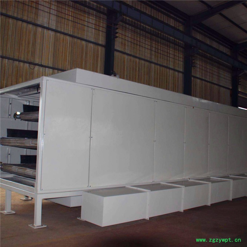 网带式烘干机有机头、烘干段、机尾、网带、传动装置、进风管、出风管、风机(热风源另置)等组成。 箱体长度由标准段组合而成,为了节约场地,可将烘干机制成多层式,常见的有二室三层、二室五层、长度6-40m,有效宽度0.6-3.0m