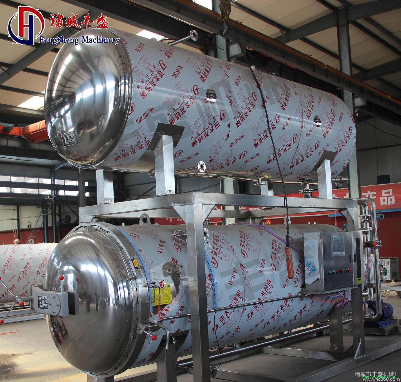 食品高温灭菌设备厂家 诸城丰盛机械 牛肉干高温杀菌锅杀菌是食品加工过程中保障食品安全的一道重要工序,杀菌技术的好坏直接影响食品安全品质。国外速冻食品市场对中国企业来说,具有极大的魅惑力,而杀菌锅是保障出口速冻食品安全品质的基础,杀菌锅的引用加快我们速冻食品打开国外市场。 生产和包装车间内的空气中含有很多的细菌等微生物,这些微生物会附着在速冻食品物料或待包装的产品的表面,污染食品,使食品在日后的保存期内变质腐败。冷冻只能抑制细菌滋生,不能杀死细菌。因此,食品在真空包装以后,必须通过杀菌锅进行高温杀菌才能达到长时间保存不变质的效果。