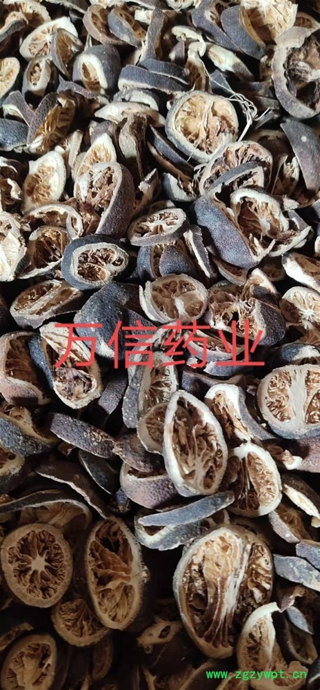 性状:呈不规则的圆球形,部分被横剖为两瓣,直径0.3-2cm。外表面深灰色或黑绿色,有细皱纹及小瘤状突起,可见细密小凹点(油室),顶端有稍突起的花柱残基,基部有圆形的果柄痕。质坚硬,横剖面果皮黄白色或淡黄棕色,厚0.15-0.4cm,中央有瓤囊7-13瓣,干缩成片状,气清香,味苦辛。以个匀、质硬、体重、肉厚、瓤小、香气浓者为佳