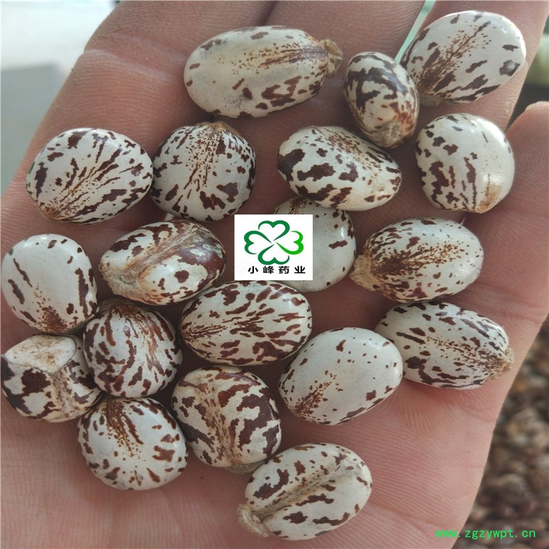 性状:呈椭圆形或卵形,稍扁,长0.9~1.8cm,宽0.5~1cm。表面光滑,有灰白色与黑褐色或黄棕色与红棕色相间的花斑纹。一面较平,一面较隆起,较平的一面有1条隆起的种脊;一端有灰白色或浅棕色突起的种阜。种皮薄而脆。胚乳肥厚,白色,富油性,菲薄,无臭,味微苦辛。