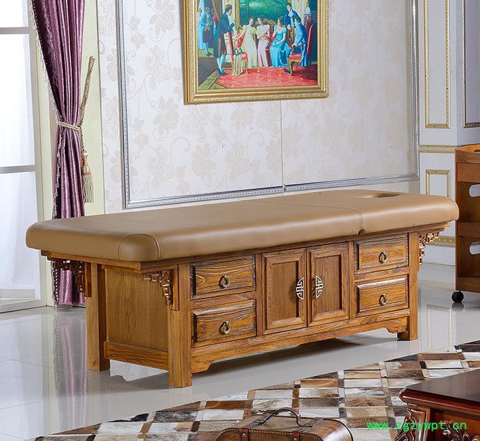 | 【产品特点】 | 进口水曲柳仿古床,会所VIP专用,经典设计,中式仿古,多柜、多抽,应用自如。特优级PU皮革,皮质柔韧,花纹清浅蔓延,唯美动人,定型高回弹海绵,是理想的卧躺软包。 | ||