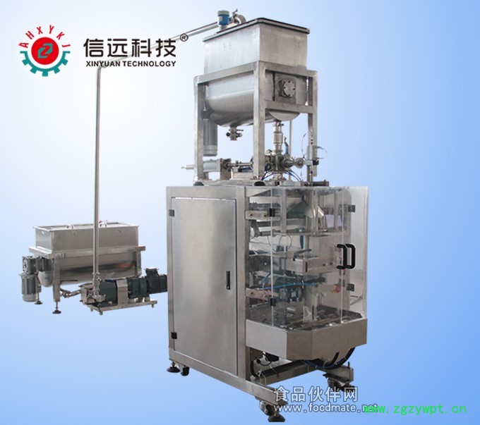 待包装物料注入冷热缸(含自动搅拌装置)----------à转子泵自动泵送物料至高位搅拌缸(受搅拌缸料位控制)--------àXY-YG酱体灌装机按设定重量自动计量充填---------àXY系列自动包装机自动制袋成型--------à 包装机完成自动封切--------à成品包装经成品输送机输送至人工装箱工位