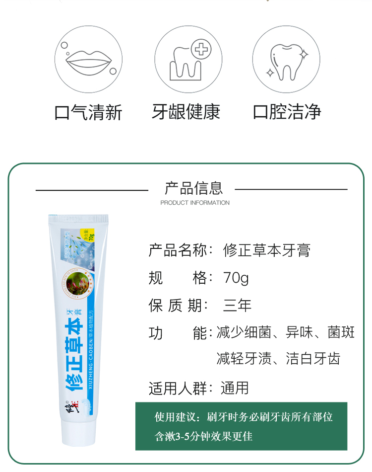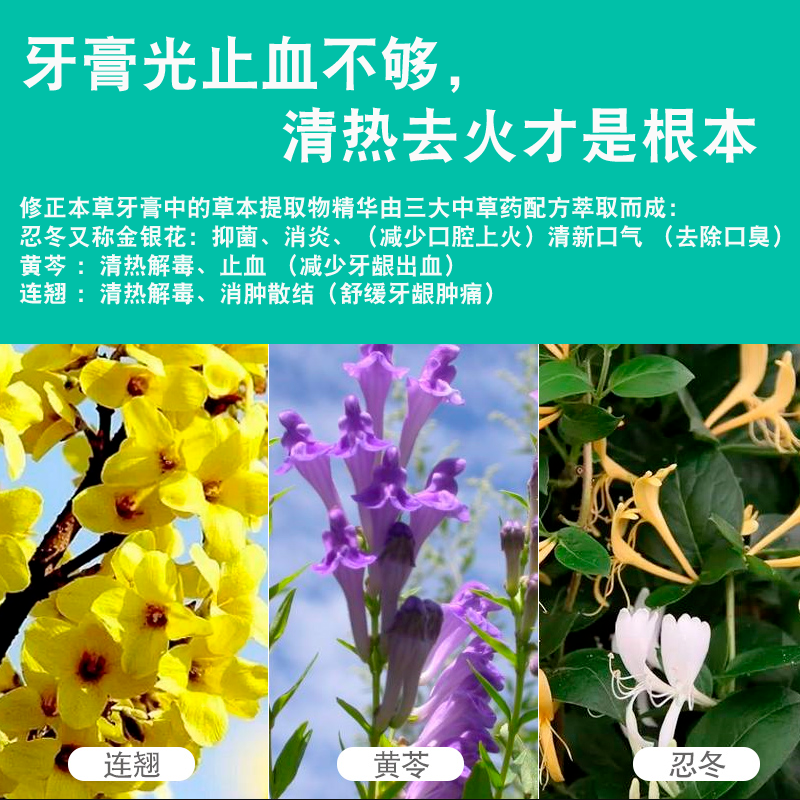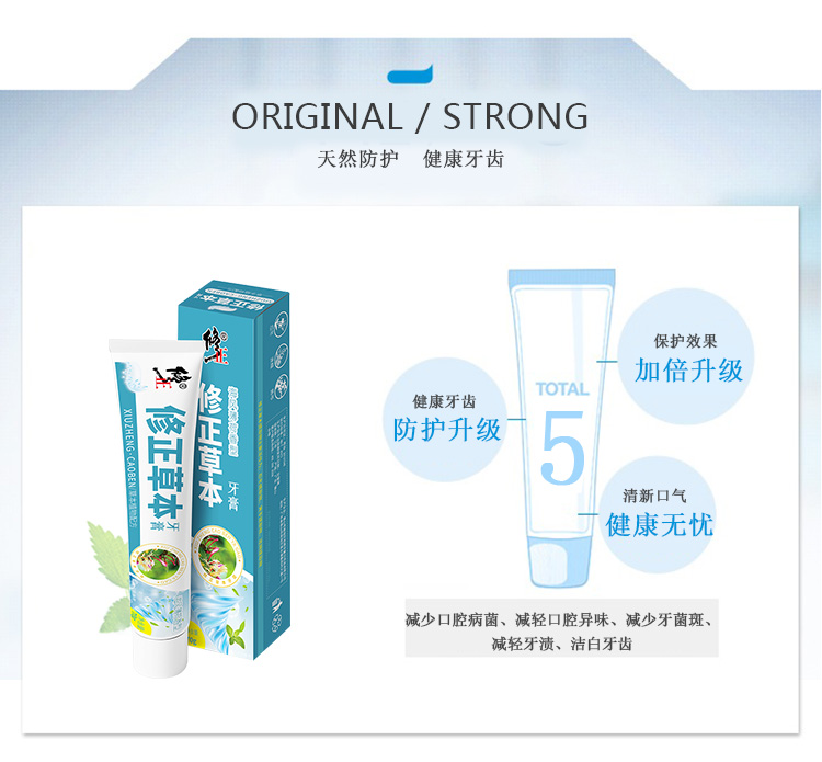 修正集团荣誉出品,针对国人口腔问题研发。汲取忍冬(金银花),黄芩,连翘三种生物科技,超微萃取,更细腻柔和。主要成分与双黄连相同,早晚使用,美白护牙的同时,也能抑制病菌从口入,健康的**,从修正牙膏开始。